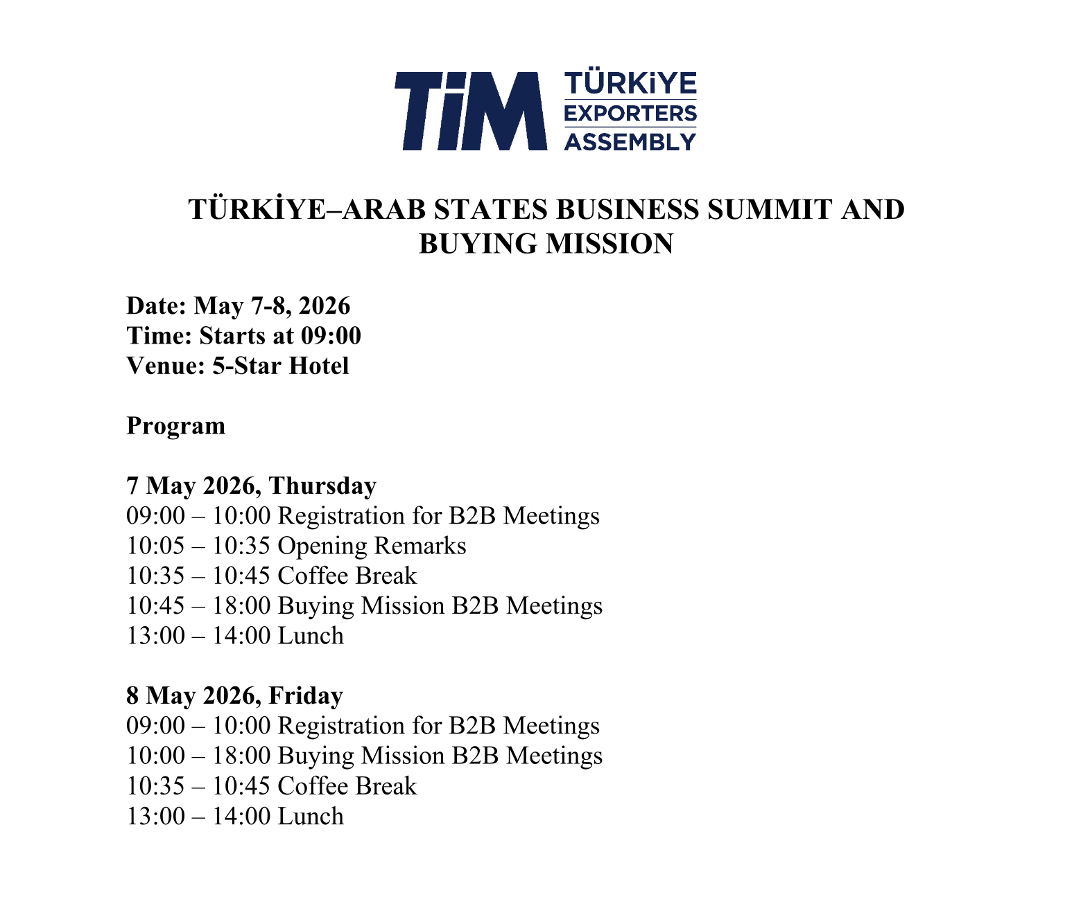 In coordination with the Republic of Türkiye Ministry of Trade and under the organization of the Türkiye Exporters Assembly (TİM), we will host the Türkiye–Arab States Business Summit and Buying Mission in İstanbul on 07–08 May 2026.